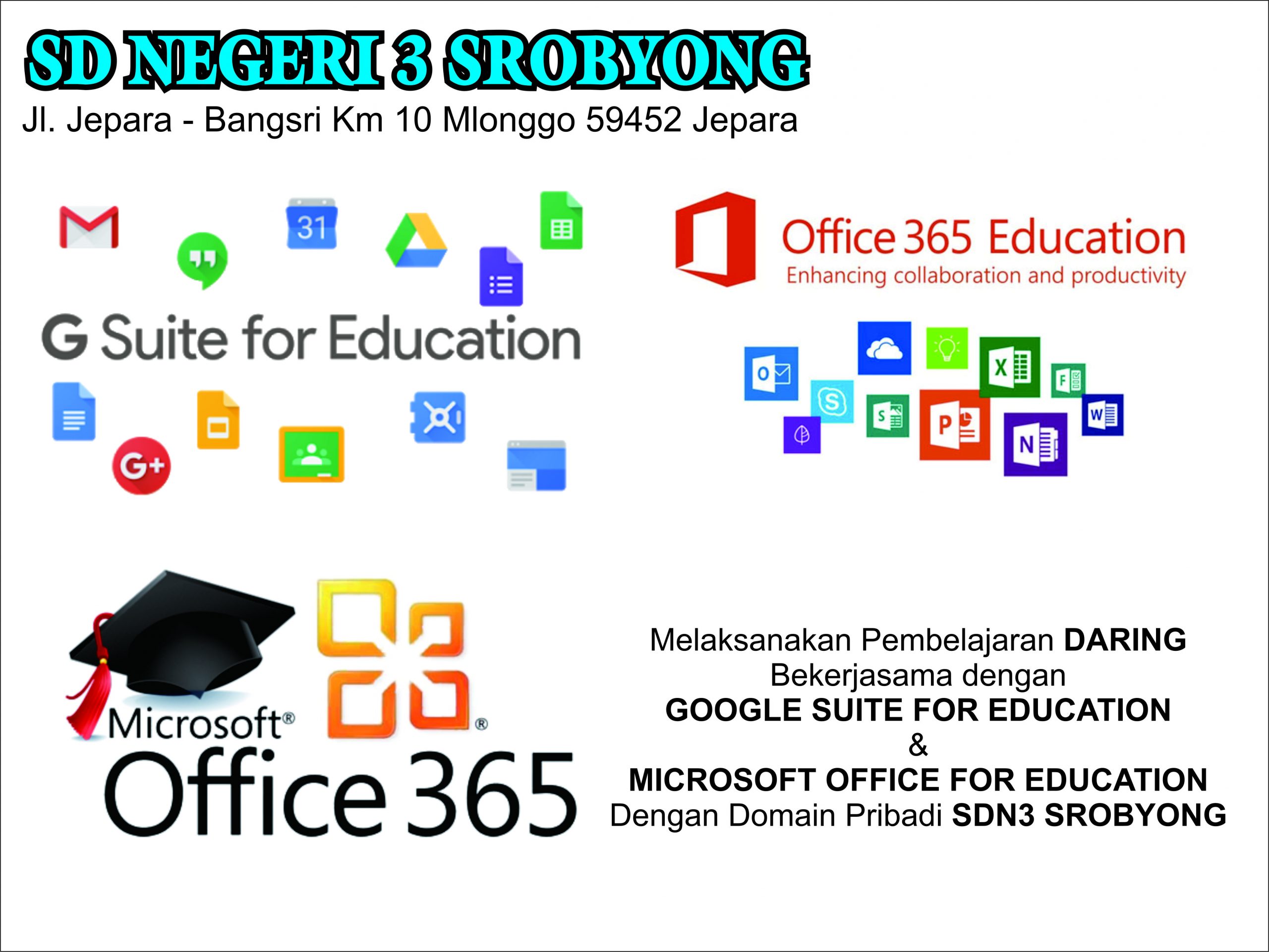 SD NEGERI 3 SROBYONG Bekerjasama dengan Office 365 For Education dalam pembelajaran Daring, dan Satu satunya Sekolah Dasar Negeri di Kabupaten Jepara yg memiliki Office 365 For Education dengan Domain Pribadi Sekolah.